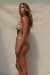 The Theo Bottom by Sunny Closets is a moderate coverage option ready for any sun or swim occasion. Featuring intricate loop detailing at either hip with a high waist shape that flatters all body shapes. Made consciously with 85% recycled nylon and 15% spandex.
