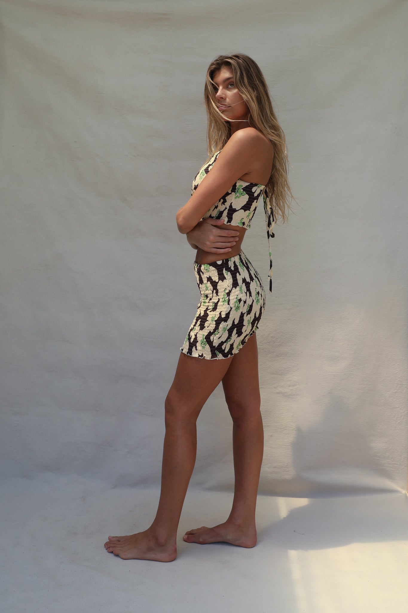 The Celine Smocked Top by Sunny Closets is mindfully made with 100% Fujette Crepe giving a fitted feel with an element of stretch. It features a classic square neck line with adjustable cross ties at the back to find your desired fit. Offering a ruffled hem line to give a touch of feminine to your sun wardrobe. Wear it as a set or with your go-to bottoms.