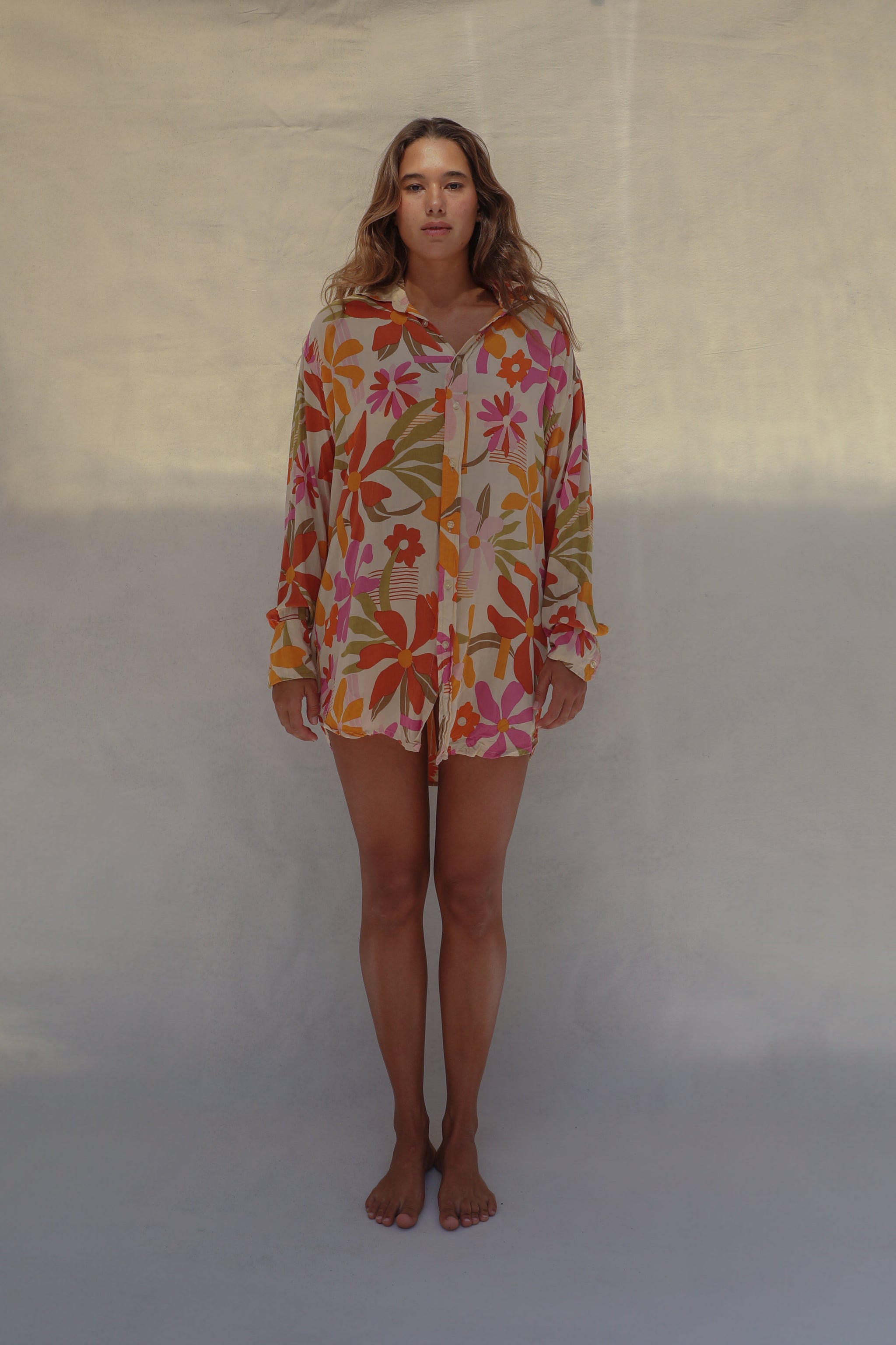 The Mimi Shirt Dress is crafted from luxurious 100% Rayon Crepe. This slightly oversized piece is designed with your summer adventures in mind, and pairs perfectly over your favorite bikini.
