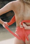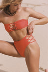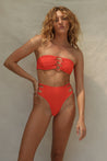 The Theo Bottom by Sunny Closets is a moderate coverage option ready for any sun or swim occasion. Featuring intricate loop detailing at either hip with a high waist shape that flatters all body shapes. Made consciously with our new custom weave texture in 83% recycled poly and 17% spandex, so you can feel good about what’s in your drawers.